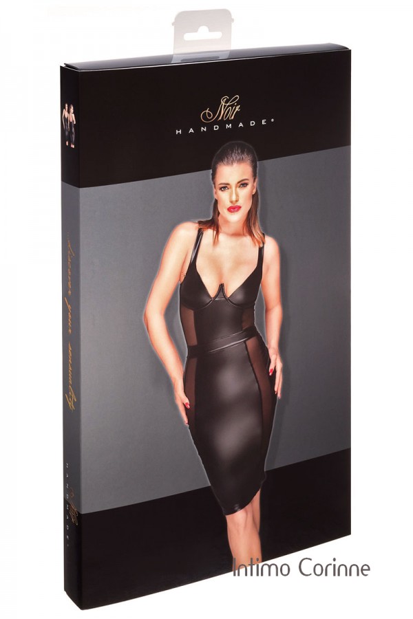 Mini abito aderente, lungo al ginocchio, in tessuto semilucido elasticizzato con profonda scollatura che accentua i seni sostenuti dalla presenza di ferretto sotto le coppe. Inserti trasparenti in tulle su entrambi i lati e rinforzo elastico sul girovita per una silhouette perfetta. Comoda zip posteriore a scoparsa.