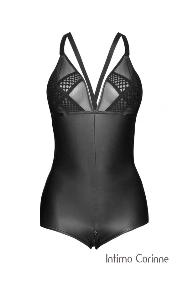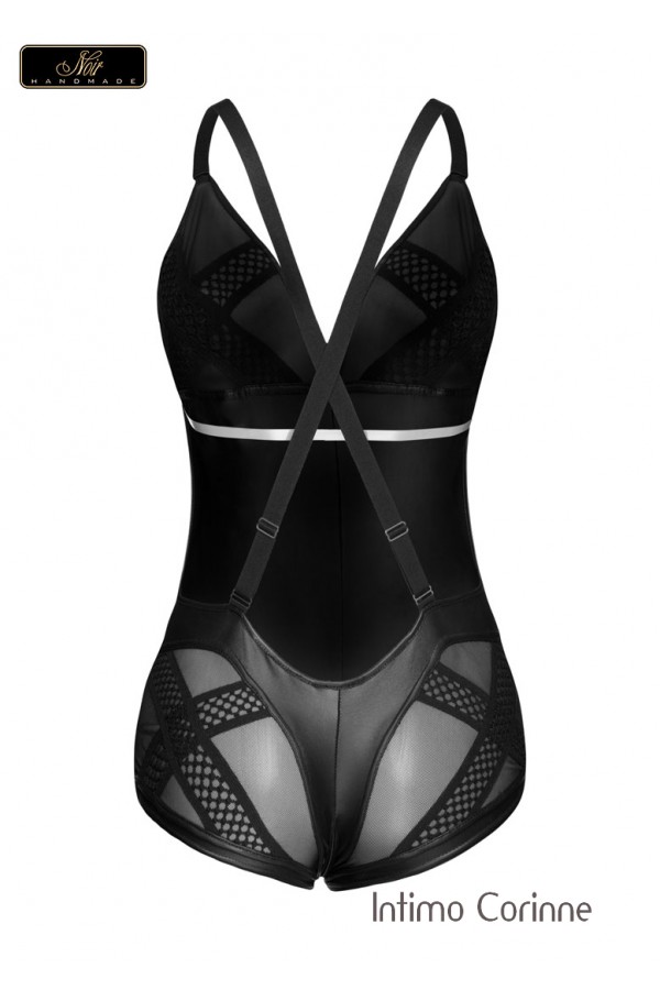 Body a pantaloncino per un aspetto supersexy. Realizzato con tessuto lucido elasticizzato effetto bagnato e tulle con strisce a croce sul seno e nella parte posteriore del pantaloncino. L'allacciatura è costituita da lunghe bretelle che si estendono sulla schiena lasciandola nuda e un nastro trasparente in silicone orizzontale entrambi regolabili. Una comoda cerniera al cavallo completa questo bellissimo indumento. Un capo esclusivo di alta qualità della collezione Noir Handmade prodotto in Europa. Realizzato anche in numerose taglie comode.