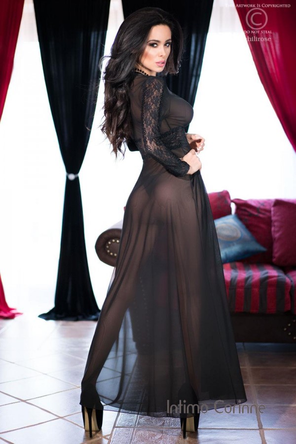 Vestaglia lunga in morbido tulle elasticizzato impreziosita con inserti in pizzo floreale lungo le maniche e sulla fascia sottoseno. Chiusura anteriore mediante cinque gancetti. Include tanga con tassello in cotone.