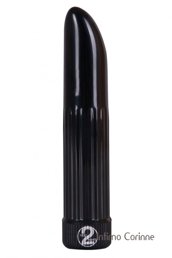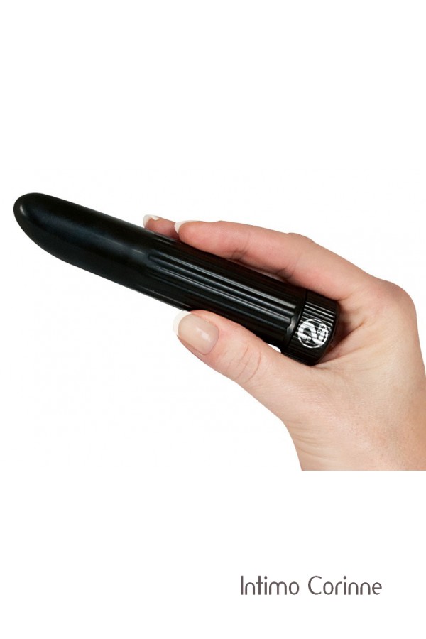 Stimolatore nero con asta ondulata ed estremità conica curva. Vibrazioni a più velocità.