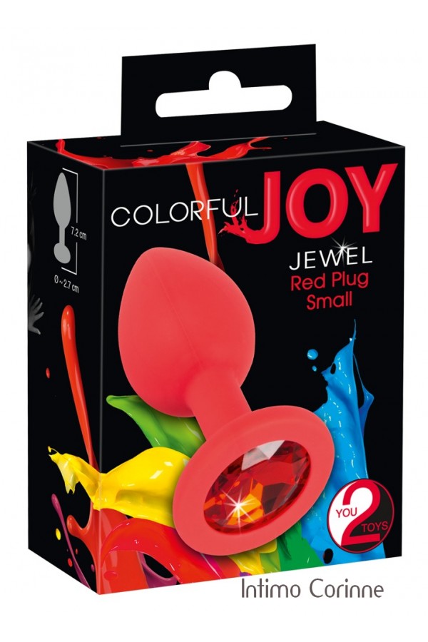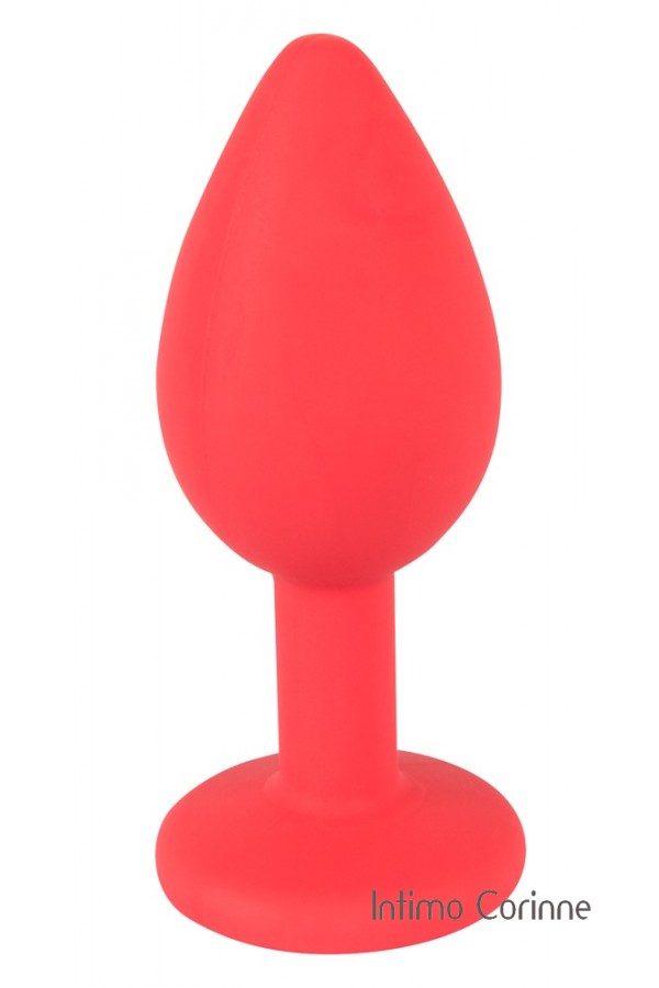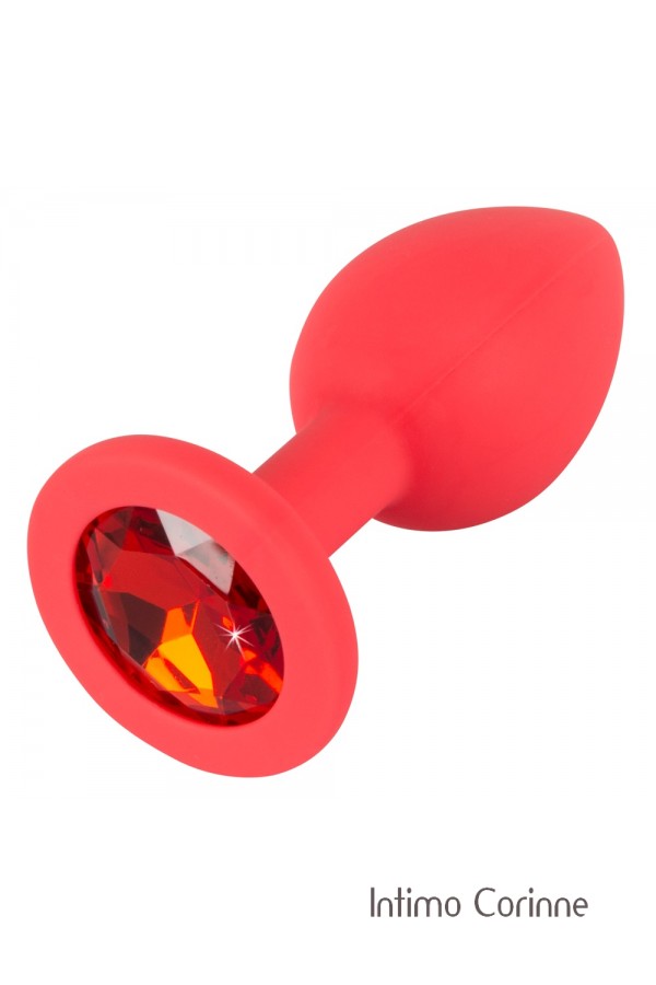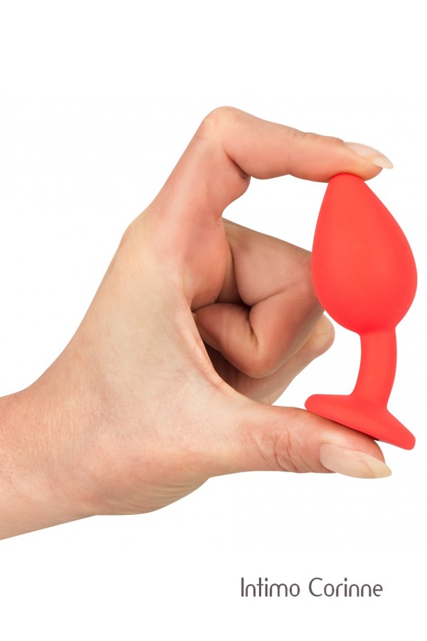 Plug realizzato in silicone color rosso acceso, soffice al tatto e molto flessibile, adornato alla base da un lucente zircone acrilico rosso. Lunghezza totale 7,2 cm, Ø 0,9-2,7 cm. Materiale: silicone con rivestimento in PU, privo di ftalati secondo il Regolamento UE REACH.