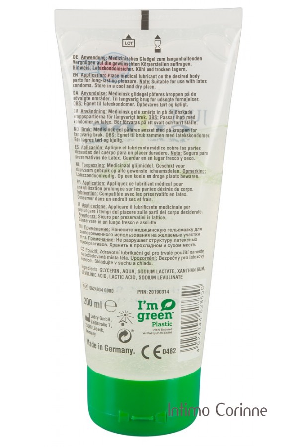 Lubrificante biologico naturale a base d'acqua, 100% vegano. Flacone compostabile in polietilene a base di canna da zucchero. Formula neutra ed inodore, sicura da usare con i preservativi in lattice. Privo di olio e grasso, può essere lavato via senza lasciare macchie o residui. Tubo da 200 ml.