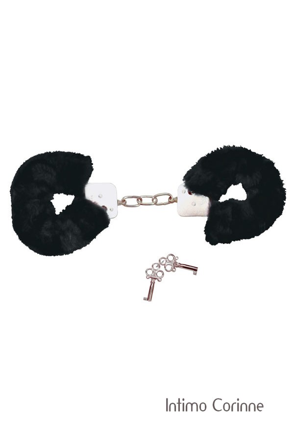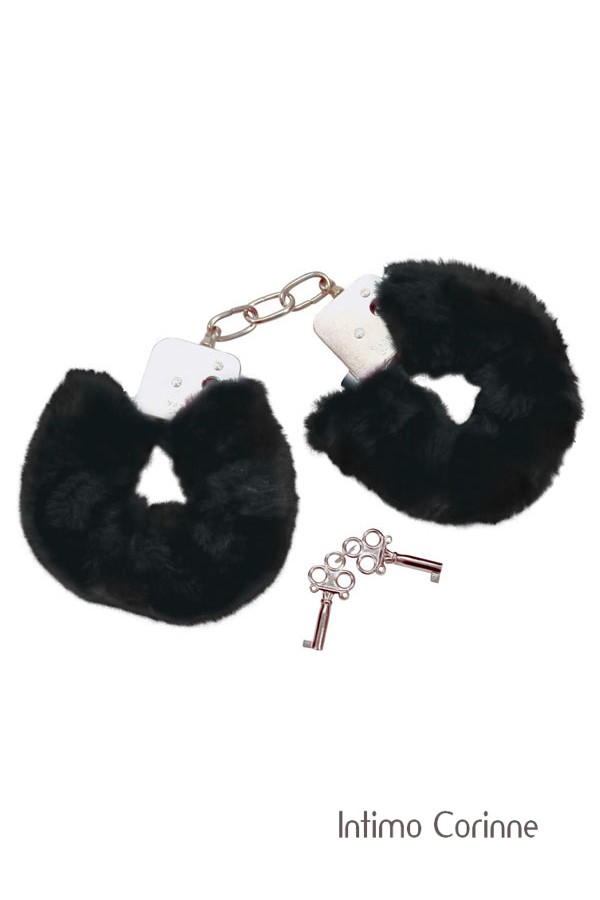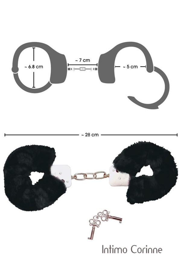 Manette in metallo ricoperte di morbido peluche nero. Polsini con sistema di sicurezza, si apre con una chiave o con una levetta. Rivestimento in tessuto sfoderabile. Ø interno ca. 4,5 cm.