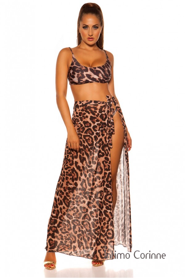 Gonna copricostume avvolgente semi-trasparente da annodare in vita; realizzata in morbido tulle leopardato, soffice e setoso al tatto. Profondo spacco laterale. (Top non incluso).