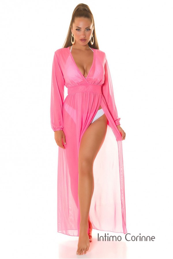 Sontuosa vestaglia semitrasparente in morbido tessuto caratterizzato da lunghi spacchi laterali e ampia scollatura. Utilizzabile anche come copri costume.