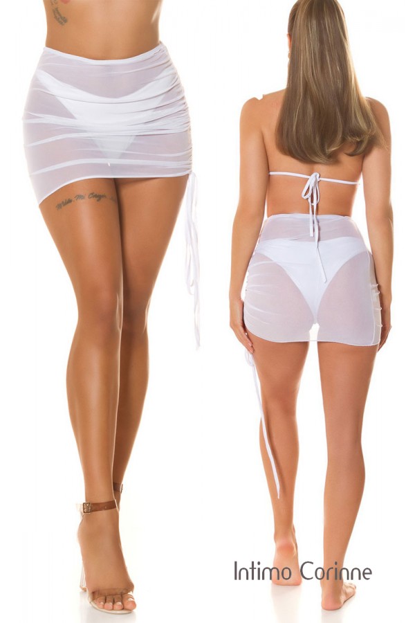 Minigonna/copricostume in leggero tessuto microretato semitrasparente con arricciatura su un fianco. Colore bianco. (Top escluso).
