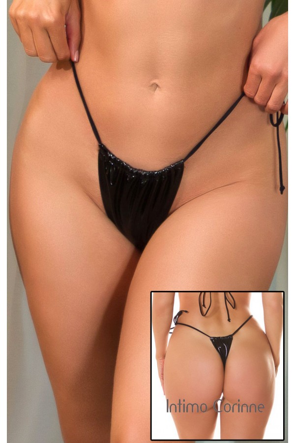 Tanga bikini brasiliano KouCla in vinile nero da legare su un fianco tramite cordino elastico. Solo tanga, parte superiore acquistabile a parte.