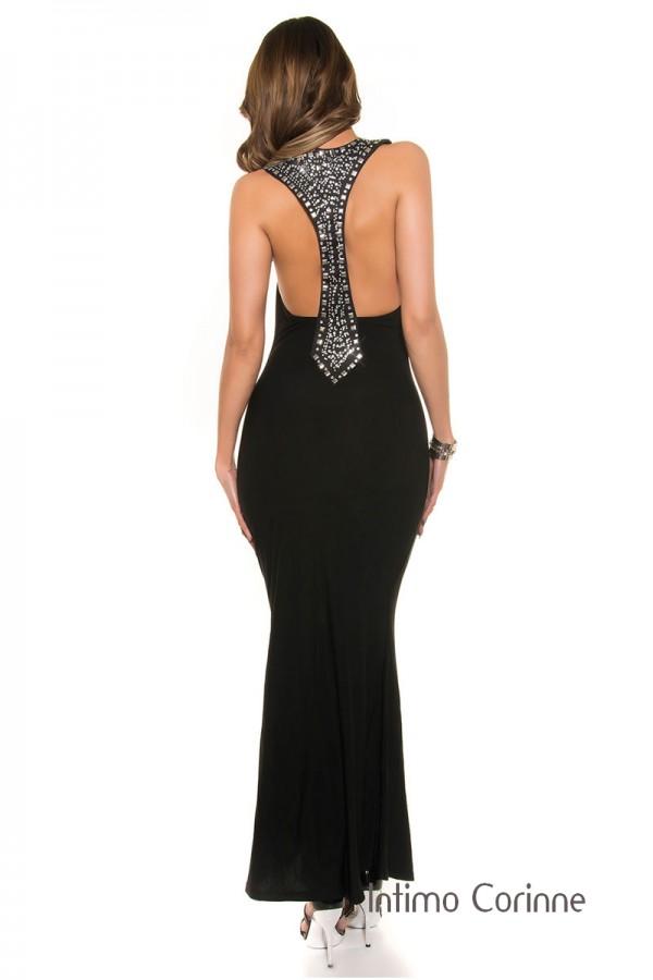 Abito lungo con scollo profondo e decorazioni sulla schiena. Nero