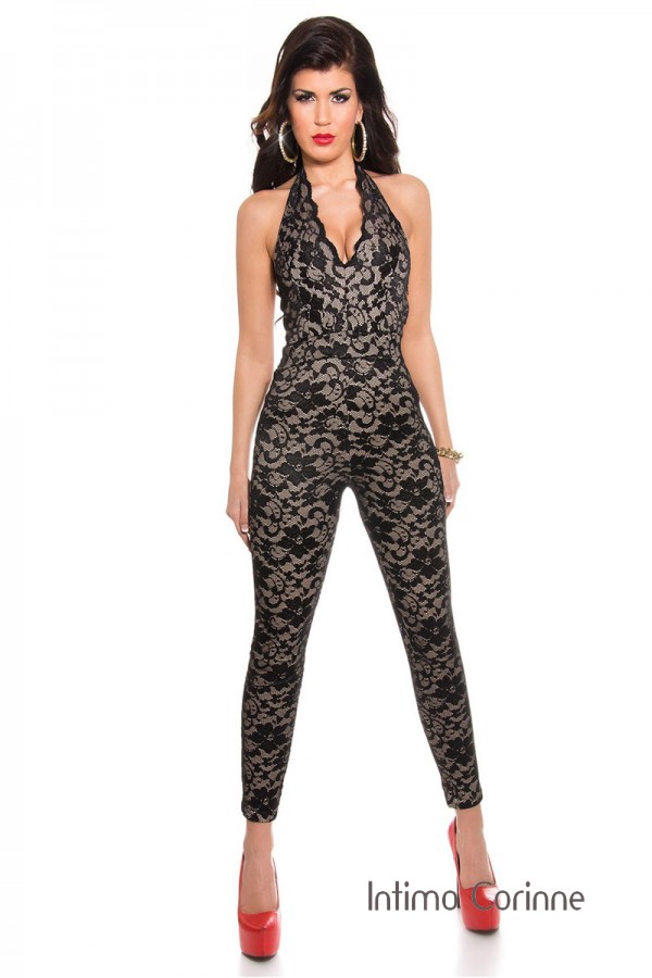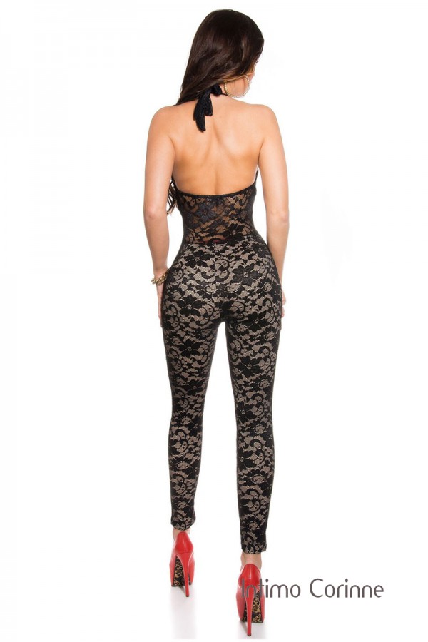 Sensuale e sofisticata: questa tuta intera nero/beige con pizzo crea un elegante effetto vedo-non-vedo che valorizza la silhouette con stile.