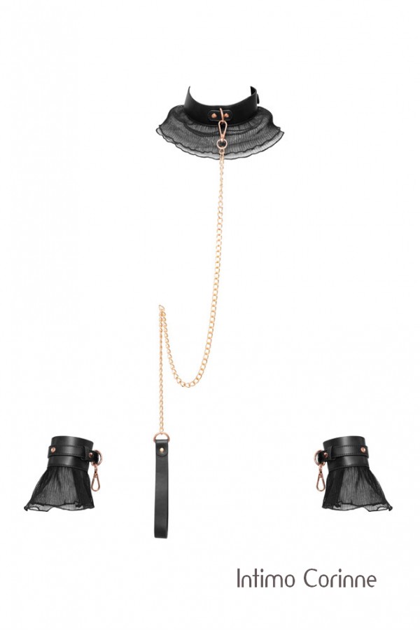 Set bondage di alta qualità, marca Bad Kitty, composto da collare con guinzaglio e polsini. Realizzato in morbida ecopelle con delicati volant plissettati e dettagli in metallo color oro. I polsini sono regolabili in circonferenza e possono essere uniti tra loro tramite anello e moschettone. Guinzaglio a catena removibile con laccio.