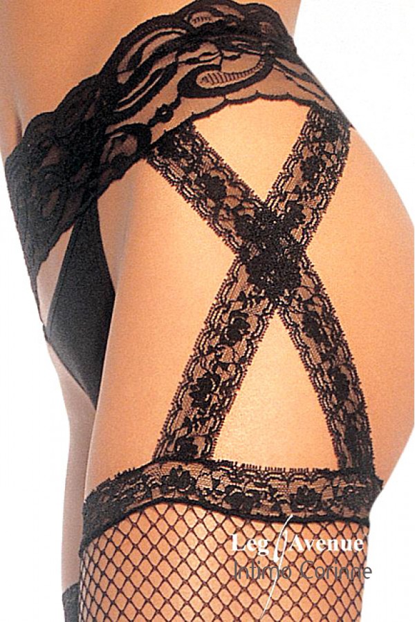 Collant in rete con balza, cintura e giarrettiere in pizzo. Queste ultime sono intrecciate sulla coscia. (Venduto senza gli slip mostrati in foto).