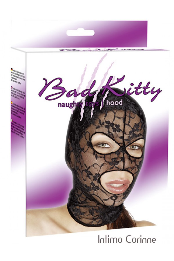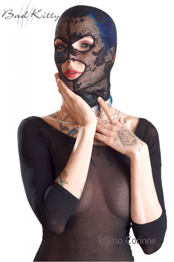 Marchera intera in pizzo elasticizzato finemente lavorato che copre tutta la testa con fori in corrispondenza degli occhi e della bocca.