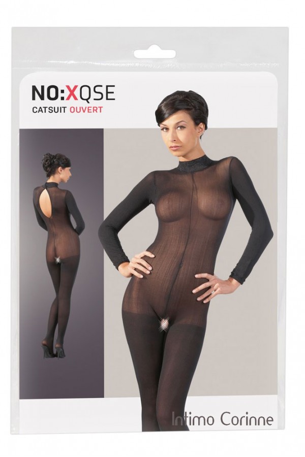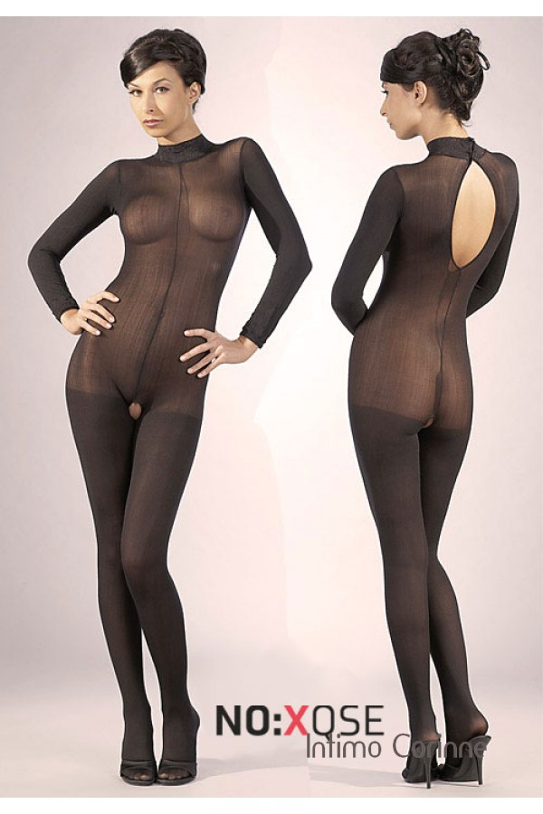 Irresistibile catsuit nera velata a maniche lunghe munita di colletto in pizzo con chiusura posteriore ed apertura sulla schiena. Aperta al cavallo. Un capo decisamente attraente. Con piede.