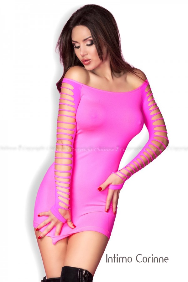 Sensuale miniabito elasticizzato a maniche lunghe con taglio a barchetta caratterizzato da asole ed intagli che esaltano le forme del corpo. Colore fucsia fluorescente se esposto sotto la lampada di Wood (luce nera).